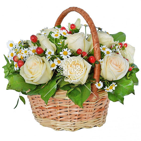 Обратите свое внимание на изящную композицию в корзине «Сказочное утро». Прекрасные молочно-белые розы  на фоне красного гиперикума и белой ромашковидной хризантемы выглядят совершенно. Композиция вызывает восторг,  окутывает нежным ароматом и чарует  невероятной нежностью!