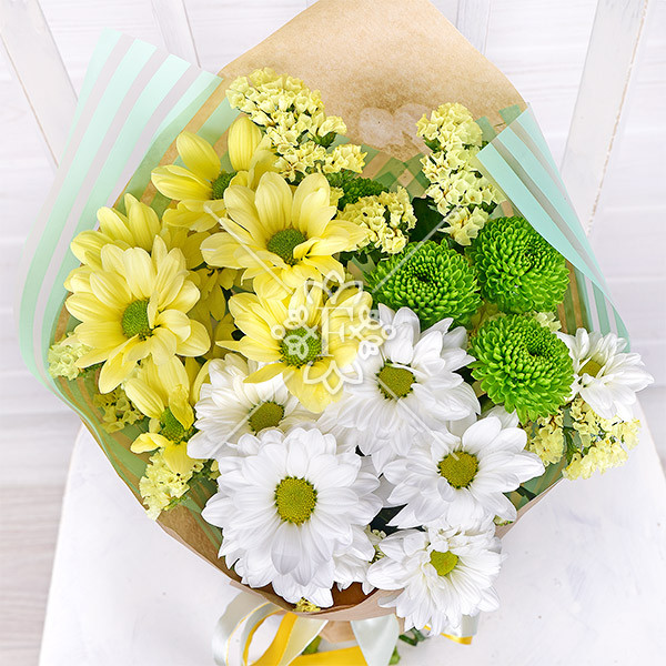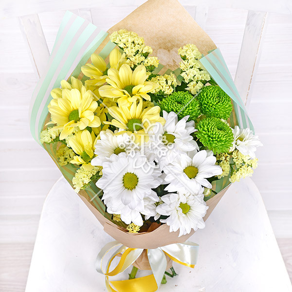 Хризантема кустовая желтая – 1 шт., хризантема кустовая белая – 1шт., хризантема кустовая зеленая – 1 шт., статица – 1 шт., упаковка, лента.