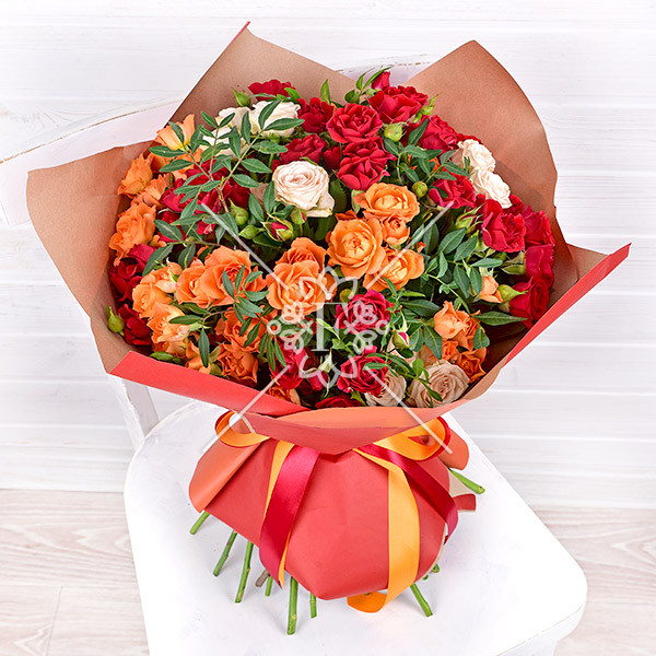 Букет «Закат в Палермо» из оранжевых, красных и кремовых кустовых роз с первого взгляда покорит Ваше сердце!  Ощущение уютного вечера и приятных комплиментов  под теплыми  закатными лучами гостеприимной Италии подарит эта цветочная композиция.