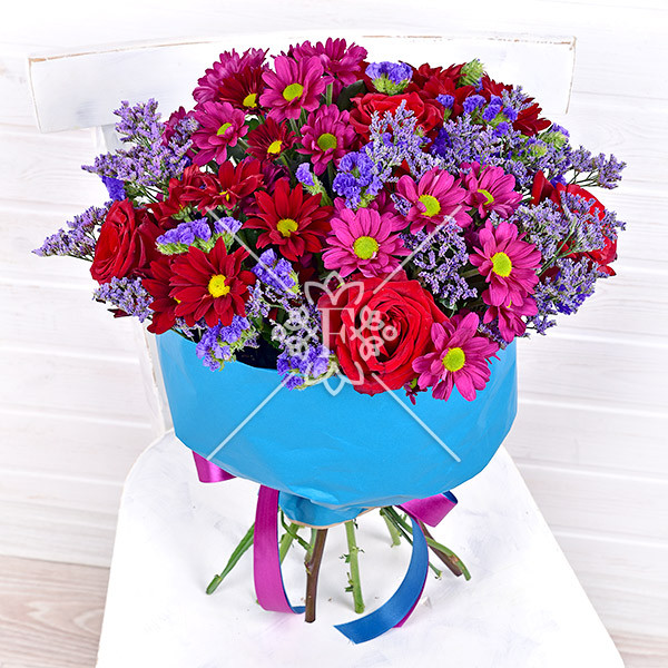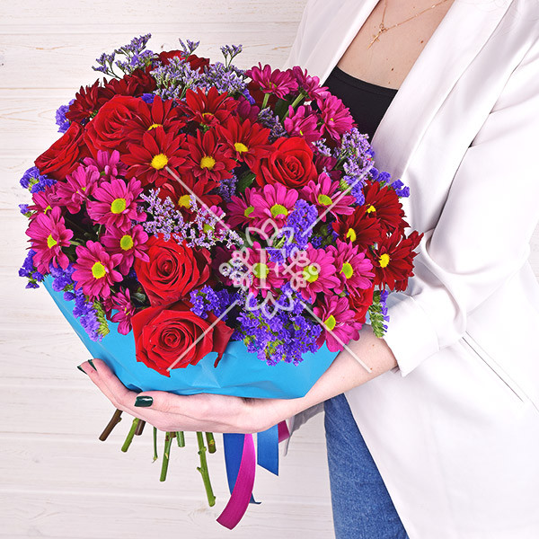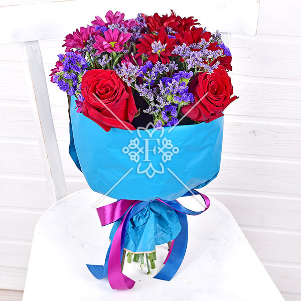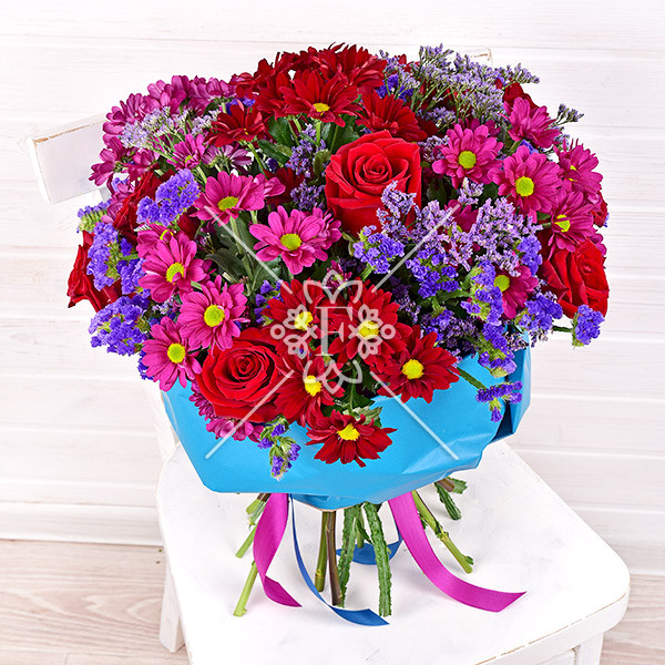 роза красная – 3 шт., хризантема красная кустовая – 1 шт., хризантема малиновая кустовая – 1 шт., статица фиолетовая - 2 шт., зелень декоративная (лимониум фиолетовый), упаковка, лента.