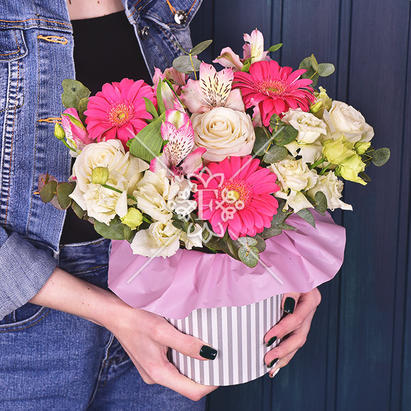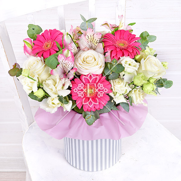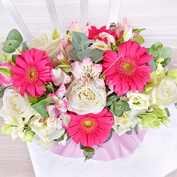 роза белая - 4 шт., альстромерия розовая - 3 шт., гербера розовая - 4 шт., эустома белая - 3 шт., декоративная зелень (эвкалипт), оазис, коробка.